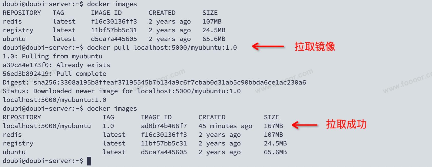 docker pull localhost:5000/myubuntu:1.0指定私有仓库的地址、端口、镜像,就可以拉取了: