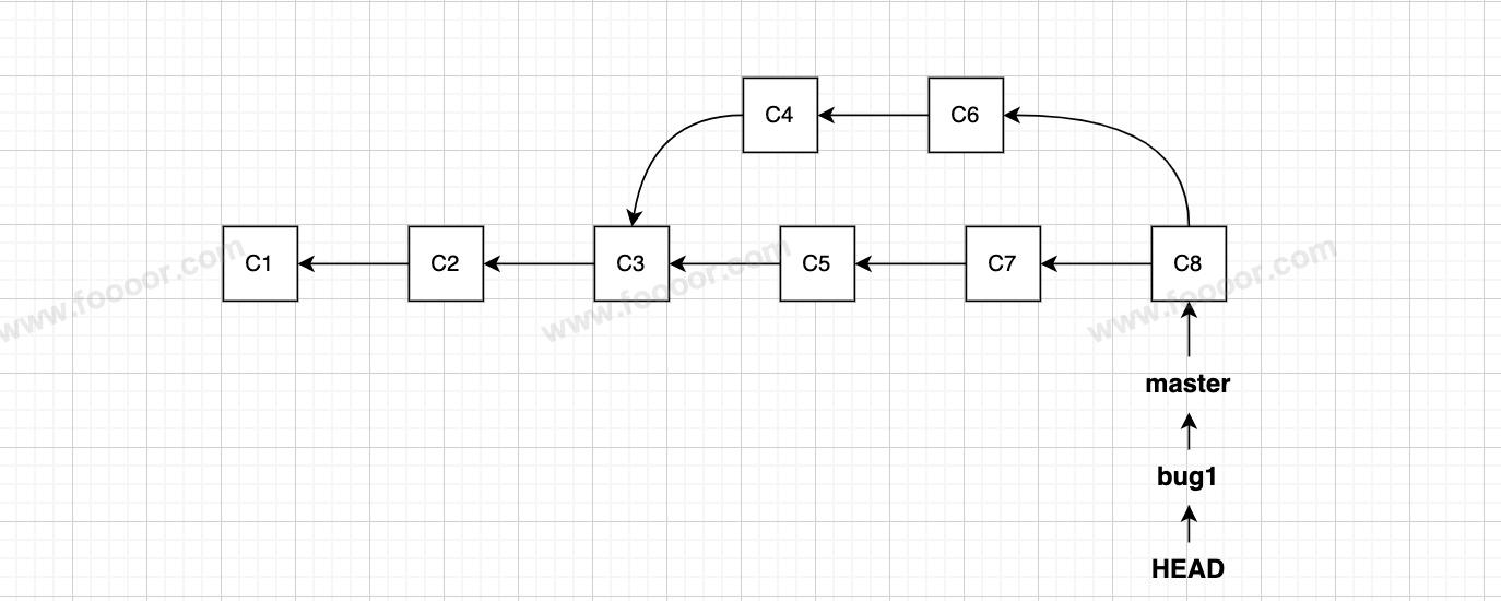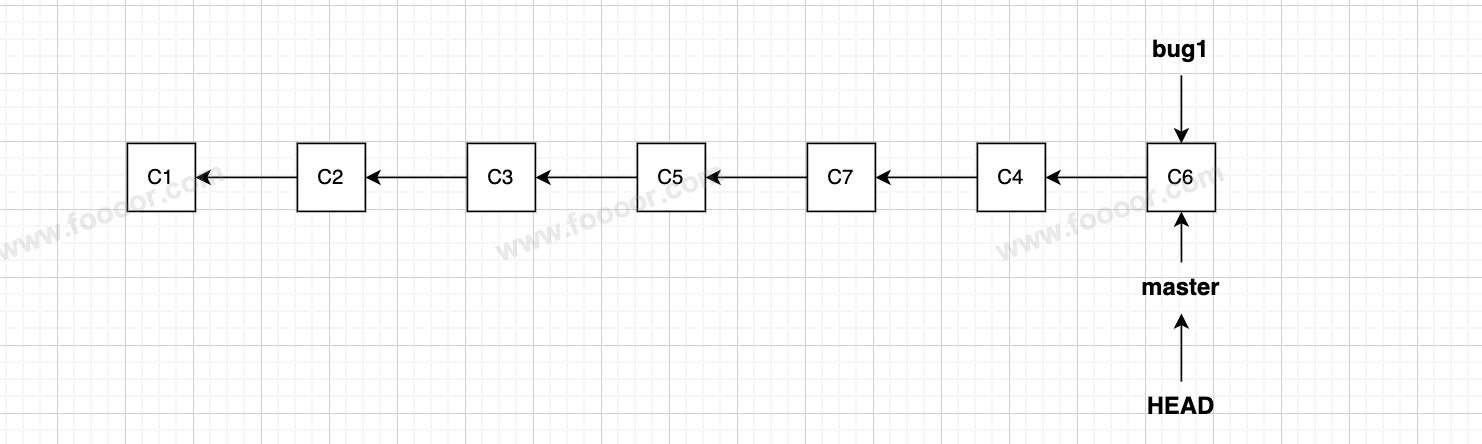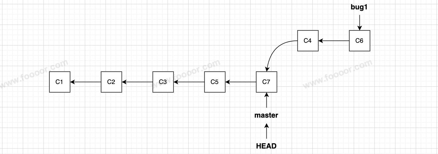 比方说我们在 master 分支上创建了 bug1 分支,然后在 bug1 分支上修改并提交了两次代码 C4 和 C6。