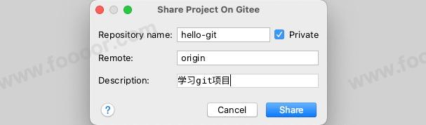 然后直接点击 Share 就可以了,这样就创建了远程仓库,并关联到了远程仓库,就可以推送代码到远程仓库。