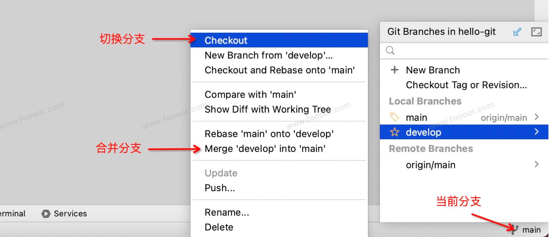 点击右下角当前分支的名称,就可以看到其他的分支,然后进行切换。