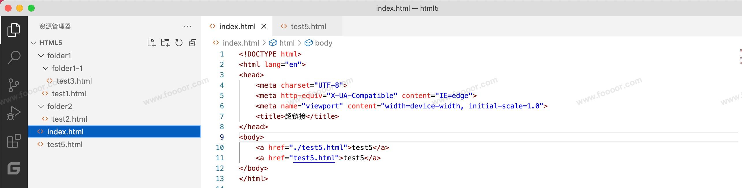 如果想要从 index.html 跳转到 test5.html,则在 index.html 中的超链接可以写成如下: