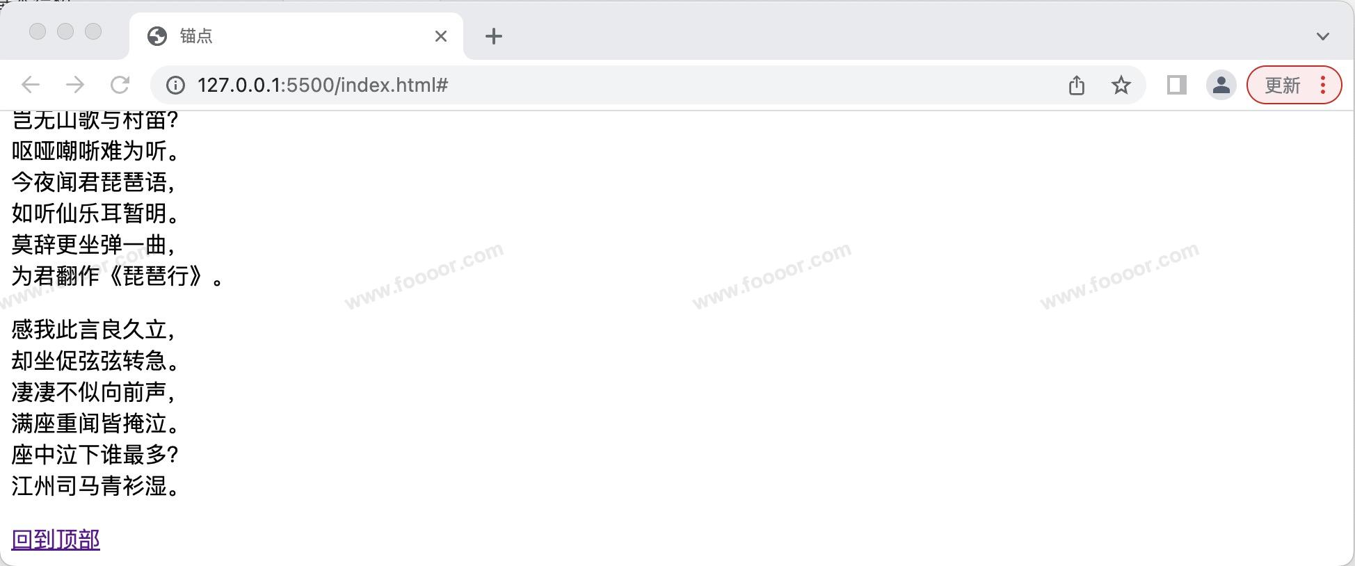 首先需要将要跳转到的位置的元素添加 id,比如我们想跳转到 ”沉吟放拨插弦中“ 开始的这段,则需要在标签上添加一个 id 属性,id 的值自己指定,但需要在当前页面唯一。