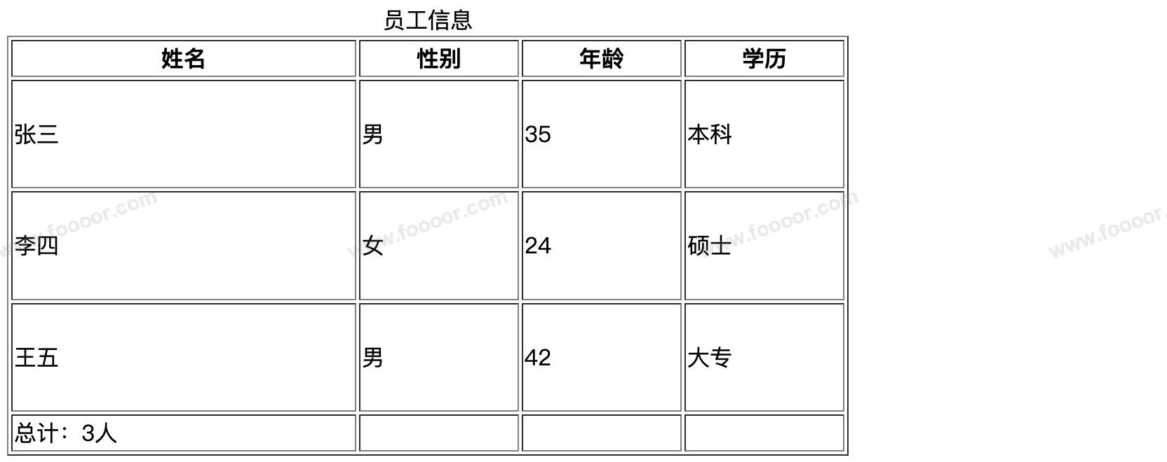 tfoot 的属性和 thead 的属性是一样的,支持 height、align、valign,但是默认的水平对齐方式是居左对齐。