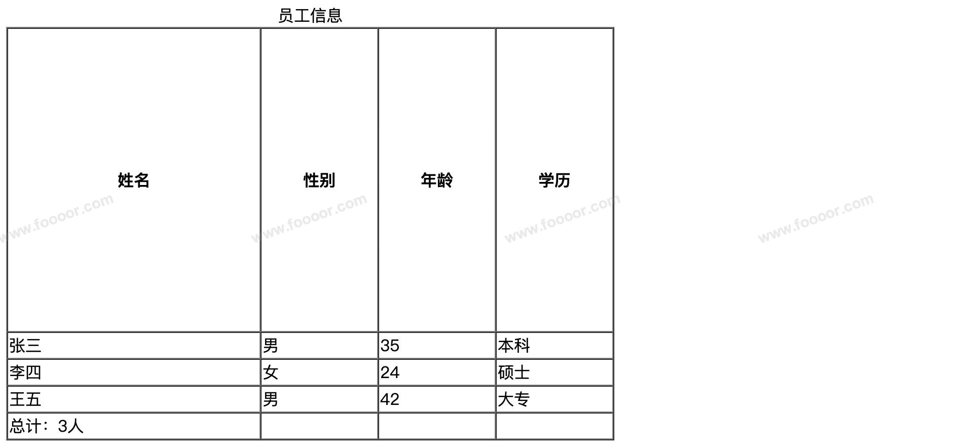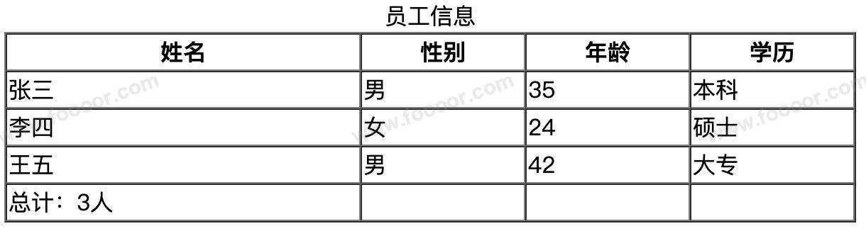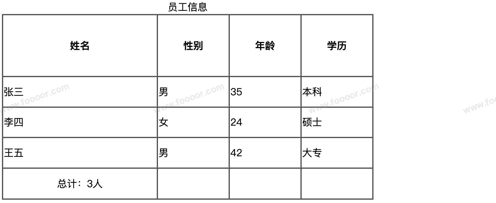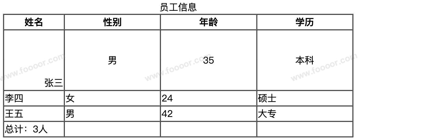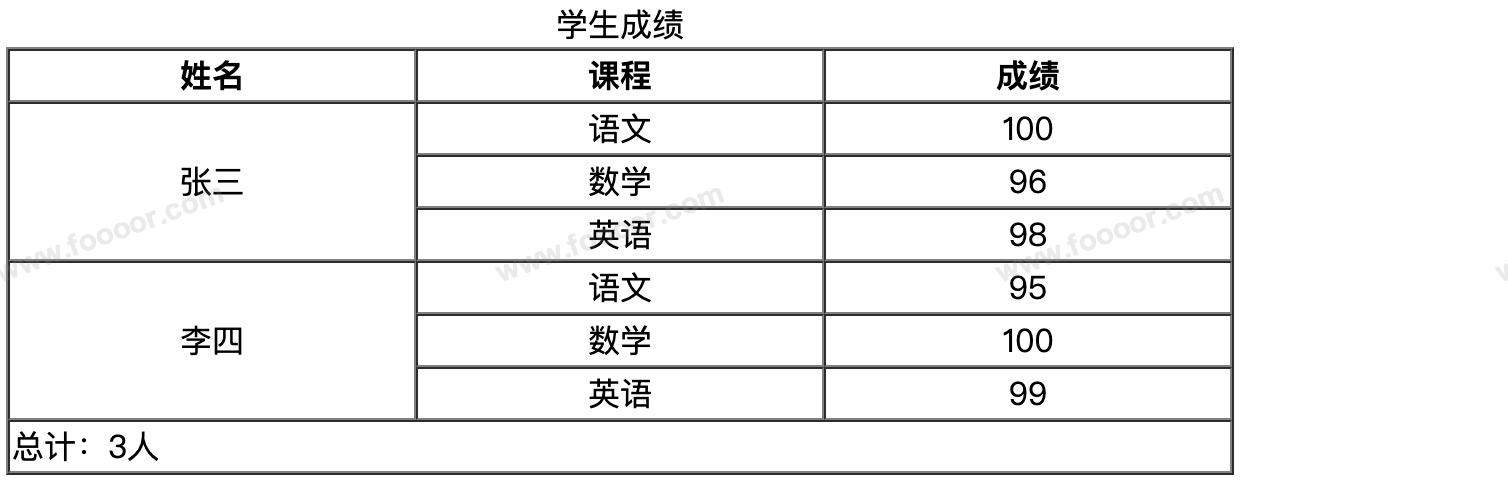 - 上面的表格 张三 和 李四 的姓名需要跨 3 行,最后一行的总计,需要跨 3 列。