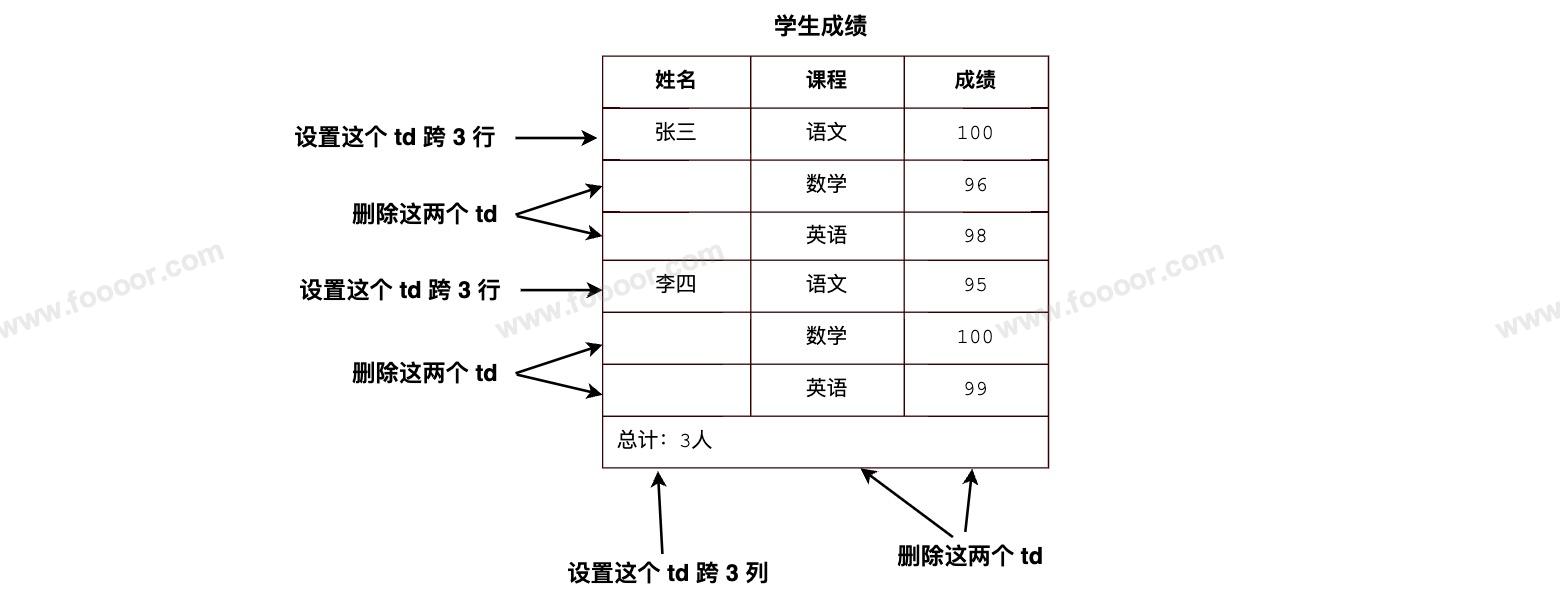 通过 <td> 标签的 rowspan 属性设置跨行, colspan 属性设置跨列。