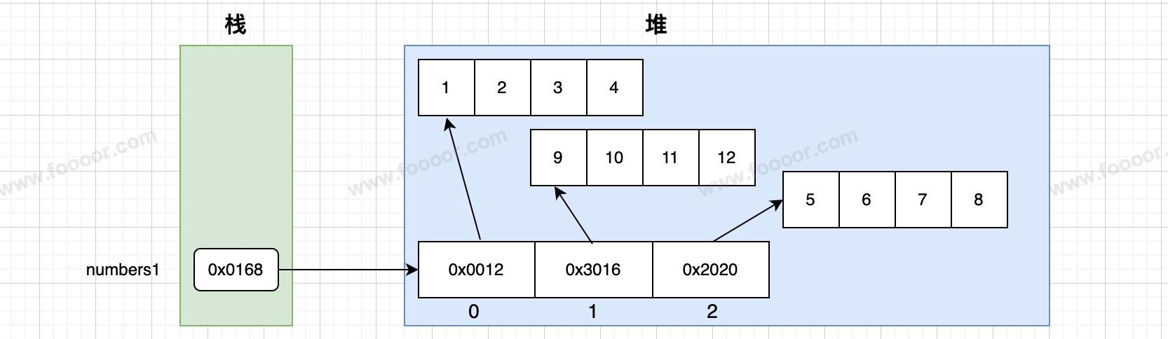 int[][] numbers1 = new int[][]{{1,2,3,4}, {5,6,7,8}, {9,10,11,12}};内存结构如下: