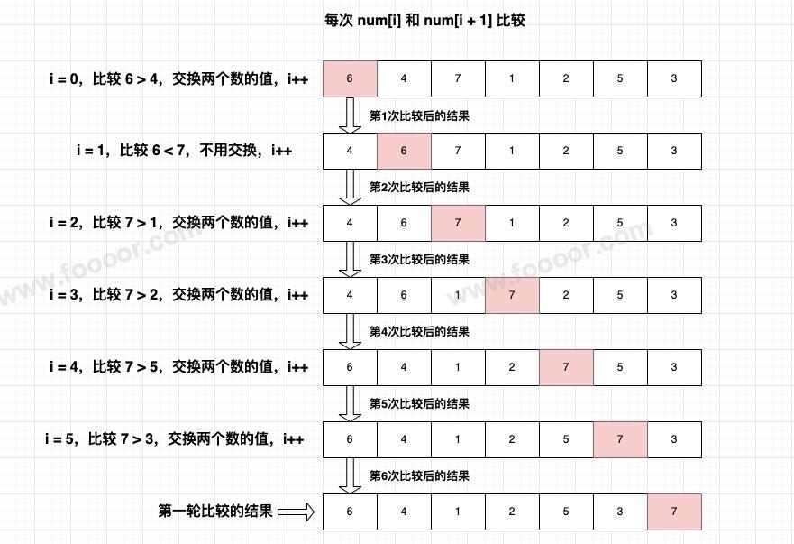 上面只是第一轮的比较,会找到最大的数,排到数组末尾;第二轮需要拿4进行比较,最终找到第二大的数6,6会沉到7前面,就不用和7比较了,也就是每比较一次,在最后面就会少比较一次,因为大的都沉到底部了,后面都是排序好的,自然就不用比较了。