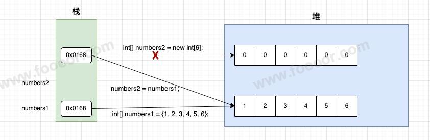 System.out.println(Arrays.toString(numbers2)); // [8, 2, 3, 4, 5, 6] numbers2的值也变了很明显上面并不能将 numbers1 的值复制给 numbers2,因为后来修改 numbers1 的值, numbers2 的值也发生了变化,说明不是独立的两份数据。
