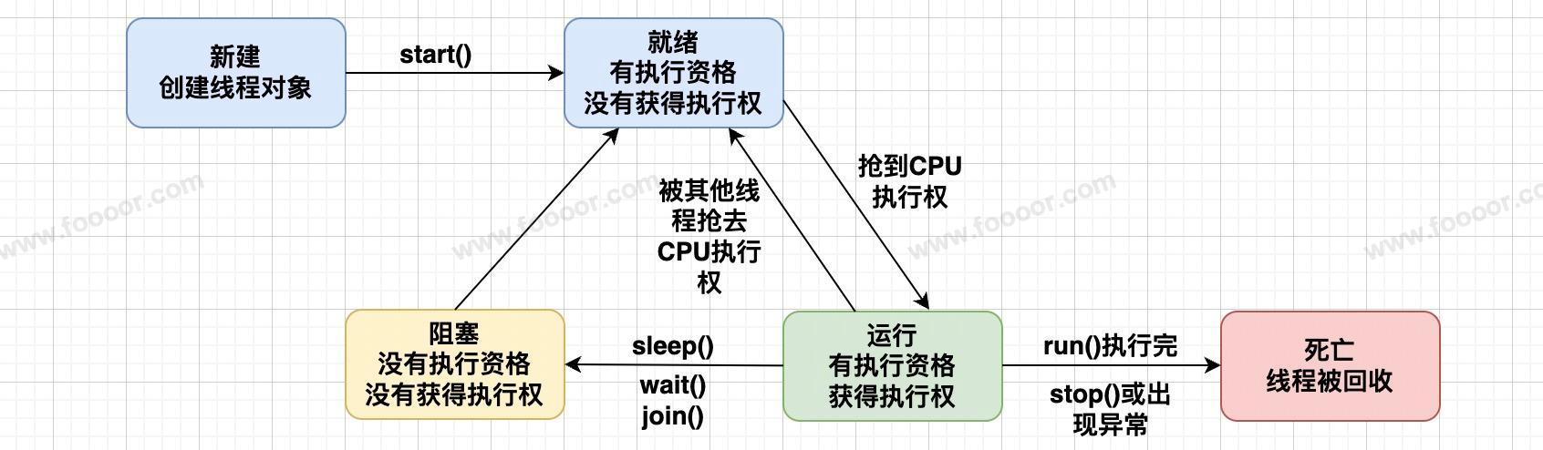就绪:线程对象已经 start() 启动了,但是还没有获取到CPU的执行权;