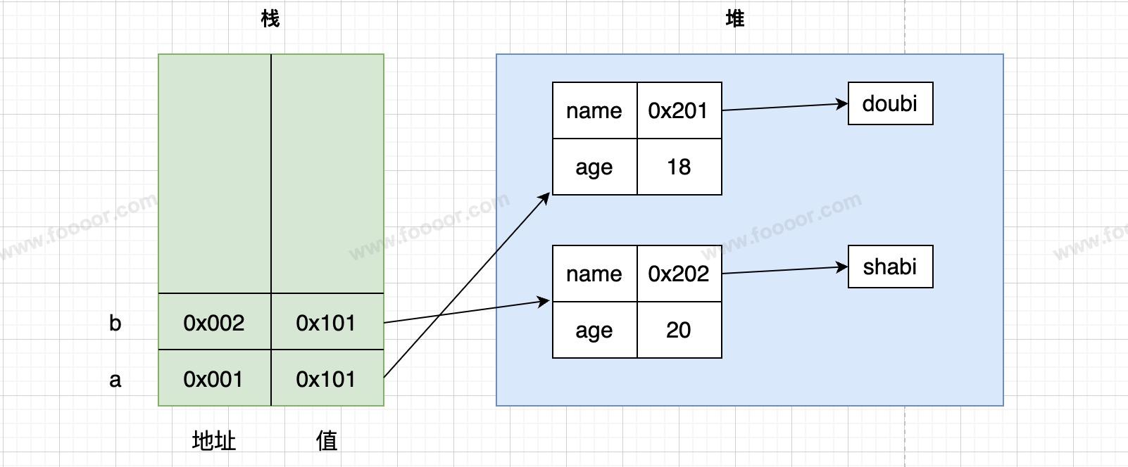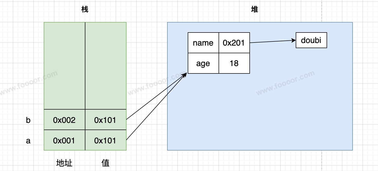 let a = {name:'doubi', age:18} ,栈和堆都分配内存空间,栈指向堆中的内存空间: