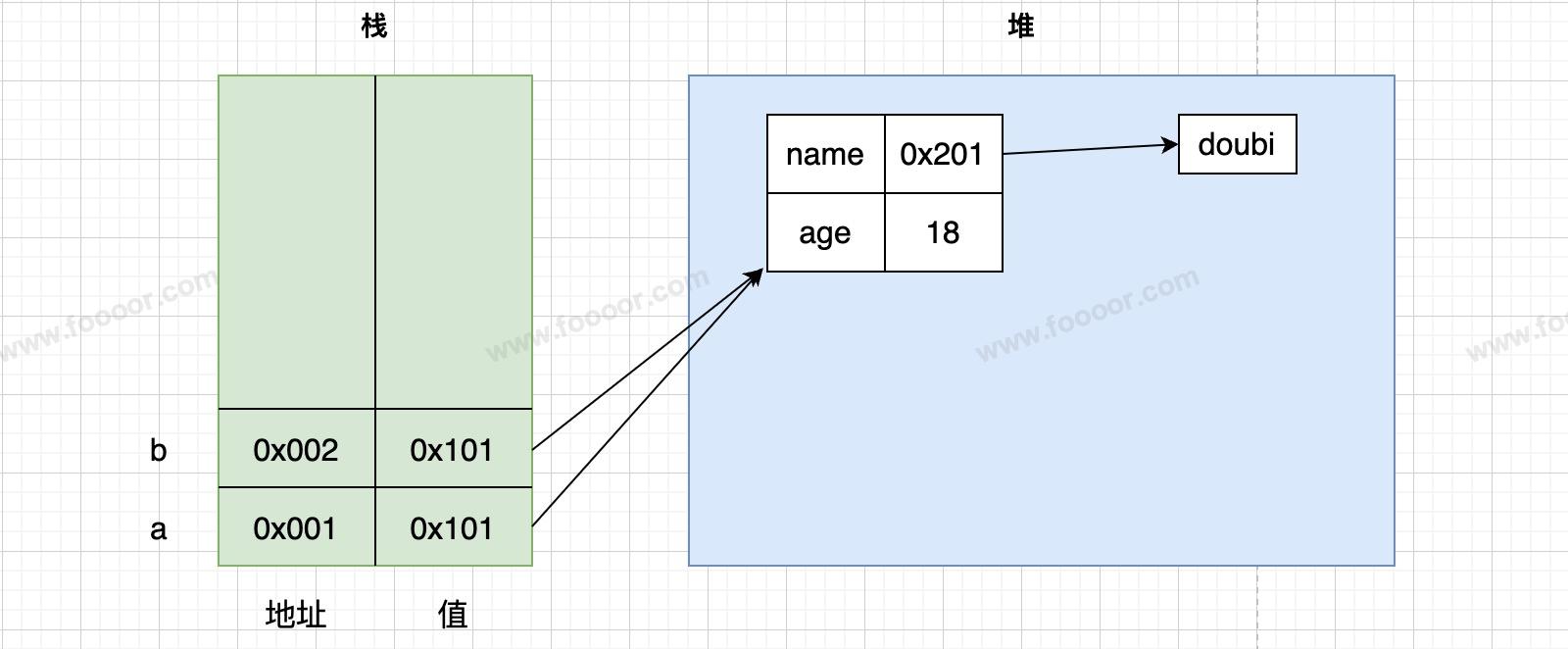 let b = a; ,a 存储的地址赋值给 b,a和b指向堆中相同的空间: