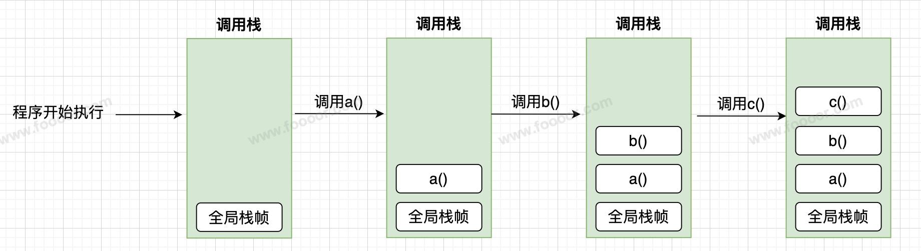 当调用 a() 函数,会将 a() 函数压入调用栈,当 a() 函数调用 b() 函数,会将 b() 函数也压入调用栈,依次类推,将 c() 函数也压入调用栈。栈帧中包含函数中定义的变量和函数声明等。