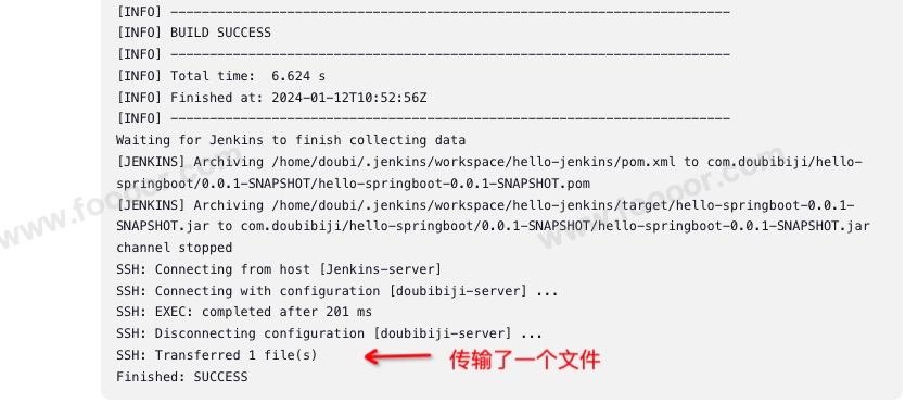 ~开始算起,表示传输到~/projects目录下,也就是传输到/home/doubi/projects目录下,则传输完成,在业务服务器上 jar 包的路径是/home/doubi/projects/hello-springboot-0.0.1-SNAPSHOT.jar,如果路径不存在,会自动创建。Remove prefix :这个表示删除的路径的前缀,如果不填写,则复制到远程后,会将