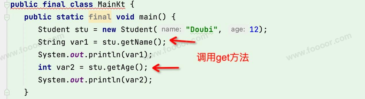 在上面使用 val和var 来定义参数,这种方式声明的主构造函数的参数同时也是类的属性,所以参数 name 和 age 直接变成了 Student 类中的属性,这种方式很简洁。