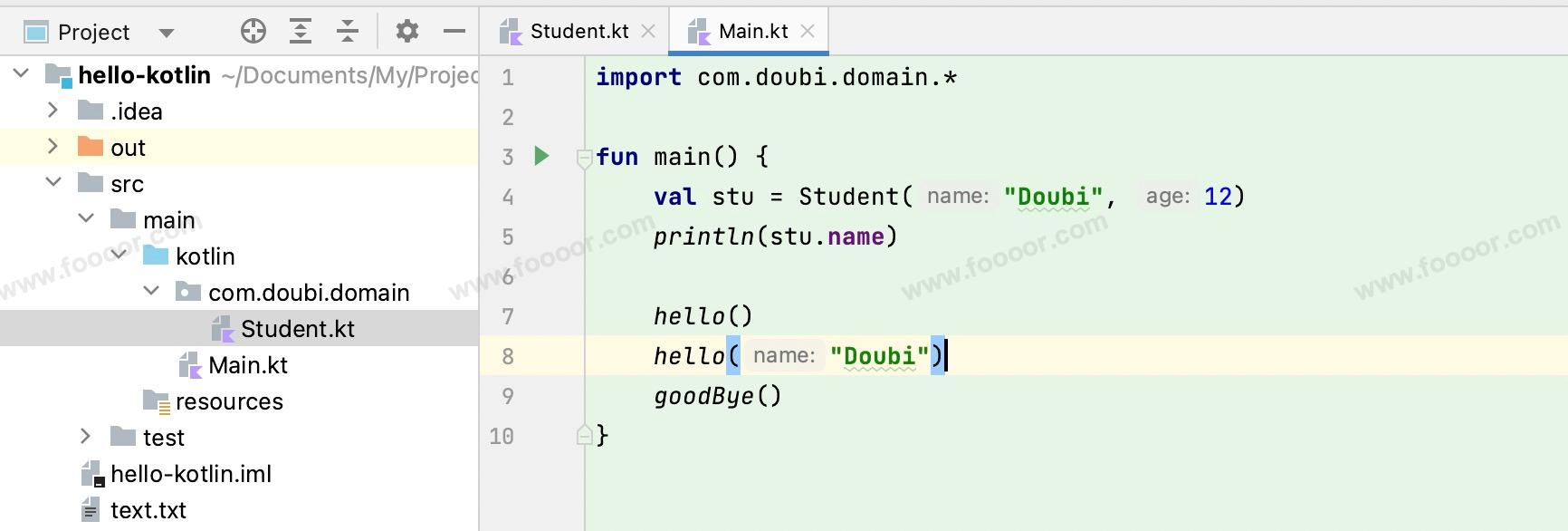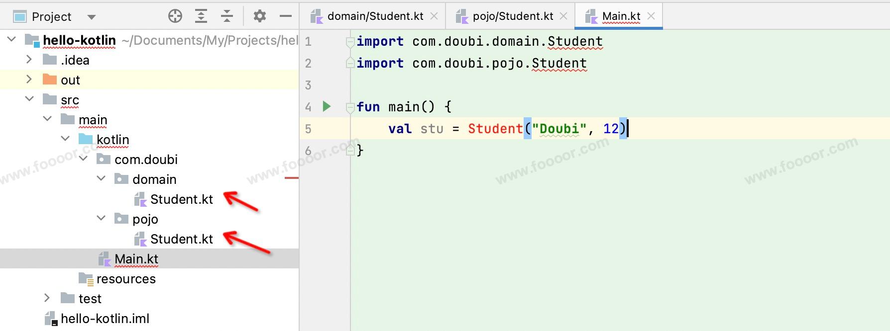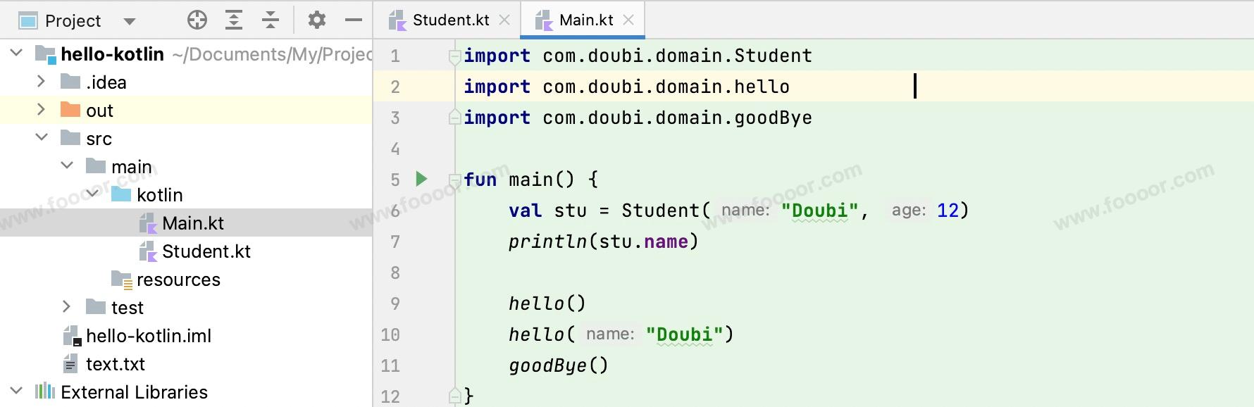 }在上面的代码中,使用 import 关键字导入了 Student 类和三个函数。在 Student.kt 文件中定义两个 hello 函数,使用一个语句导入即可。
