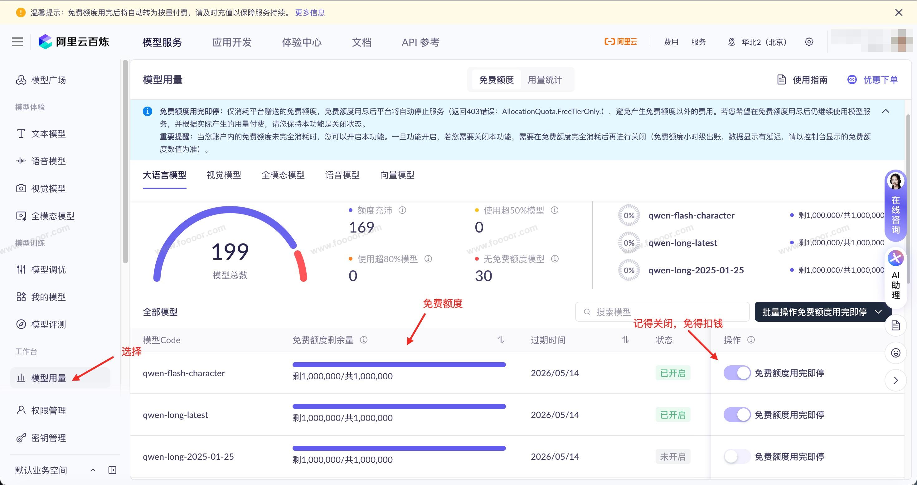 注意:选择完模型后,记得去大模型用量页面,把对应模型的"免费额度用完即停"开关打开。