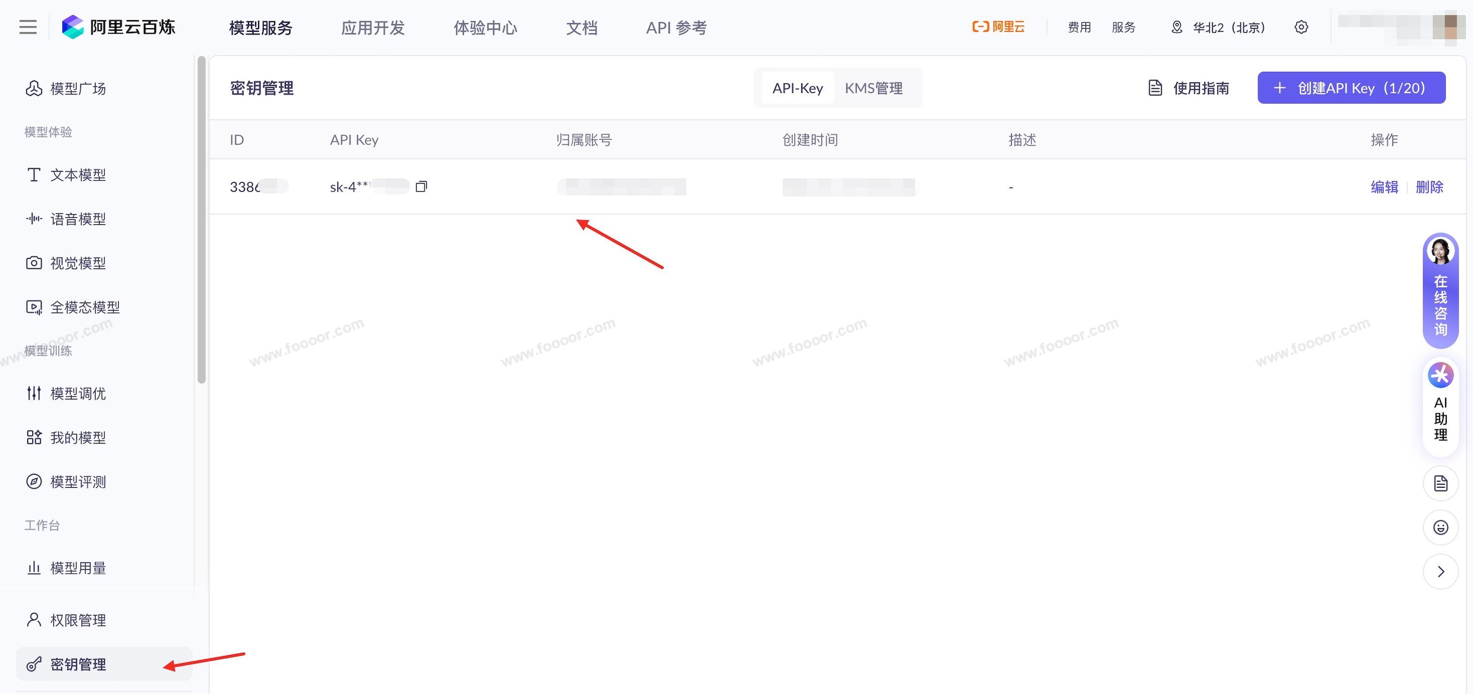 然后,点击 密钥管理 选项,创建一个 API Key,这是后续代码调用大模型时必需的。
