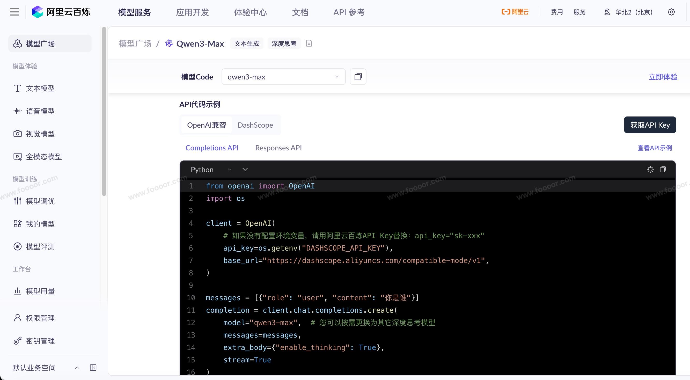 点击进入具体模型的详情页面,你会看到调用代码示例: