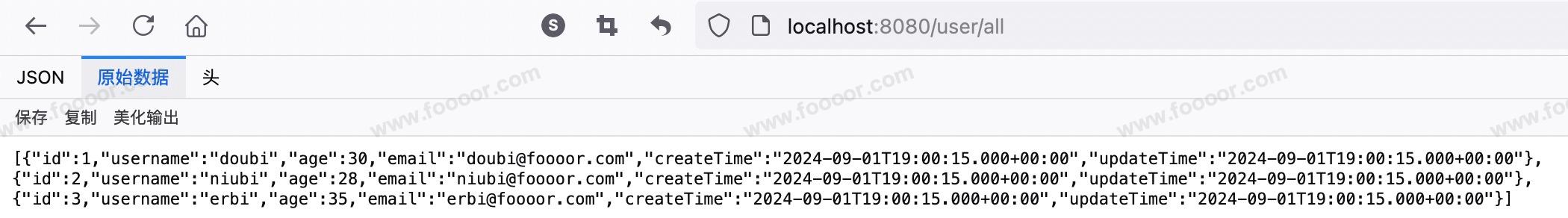 请求接口添加数据:http://localhost:8080/user/all
