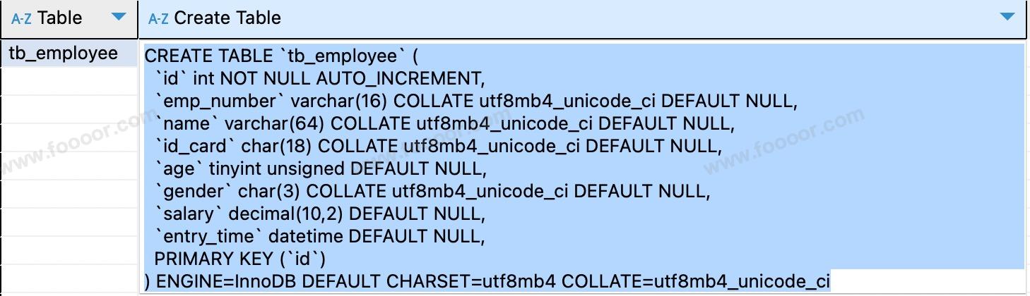 SHOW CREATE TABLE tb_employee;执行结果如下,可以查看到字段注释、字符编码等信息: