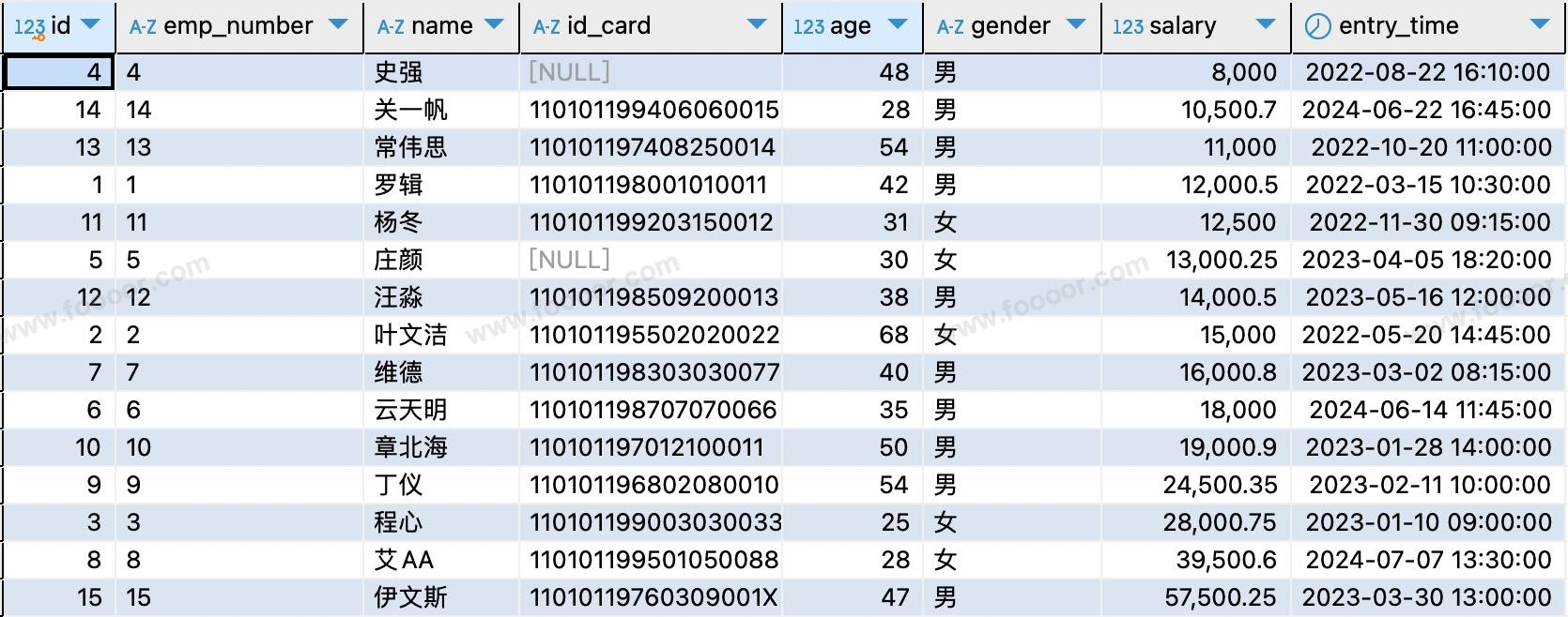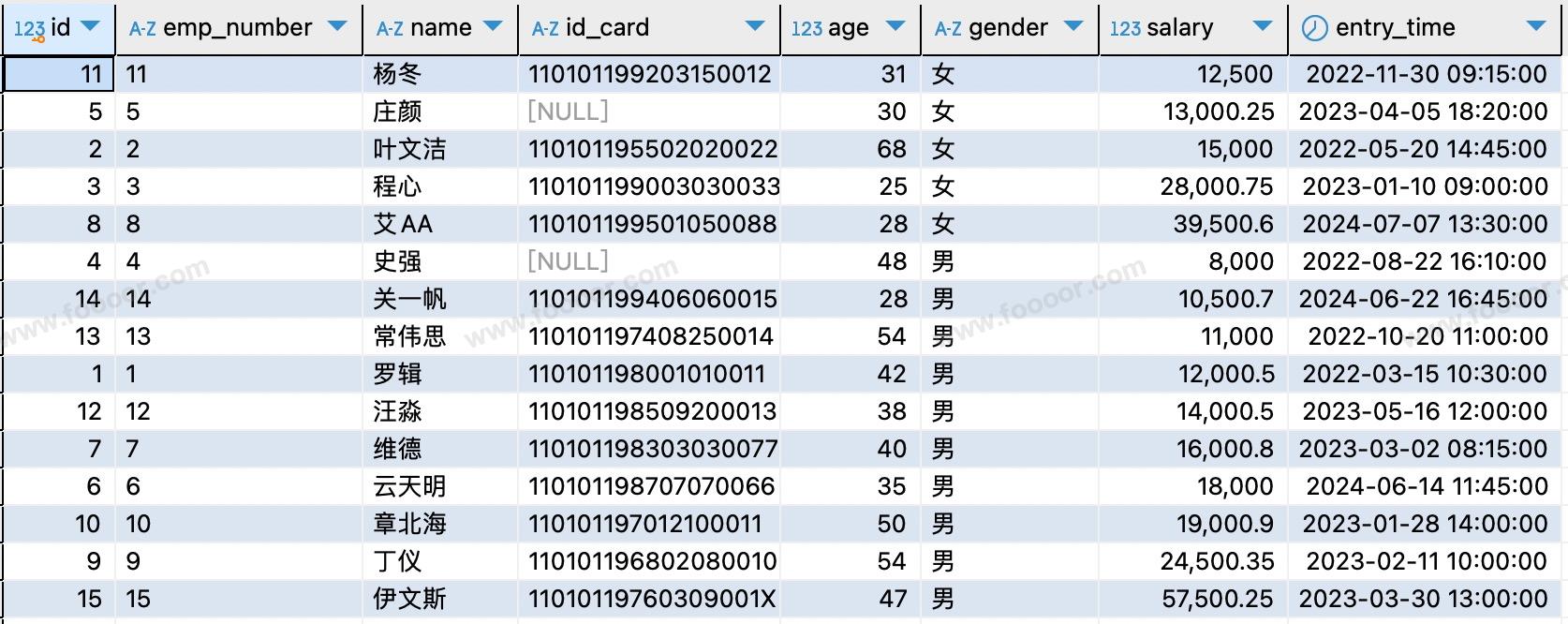 | id | emp_number | name | id_card | age | gender | salary | entry_time |