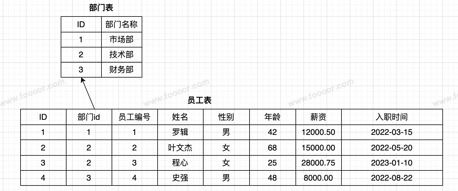 举个栗子,现在有两张表,部门表和员工表,在员工表中有部门表的 id,这样就知道这个员工是哪个部门的了,如下图: