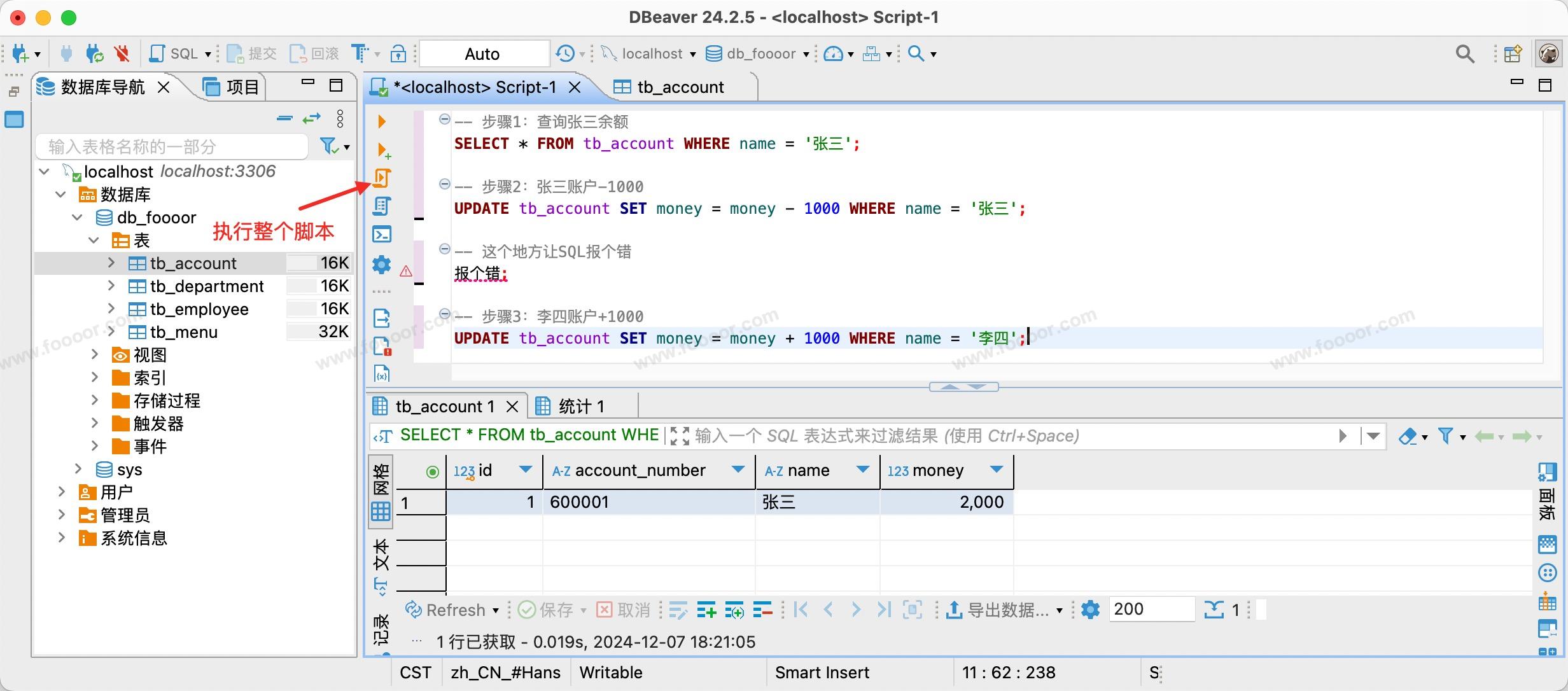 UPDATE tb_account SET money = money + 1000 WHERE name = '李四';上面的语句是作为整个脚本一次性执行的,使用执行脚本命令来执行: