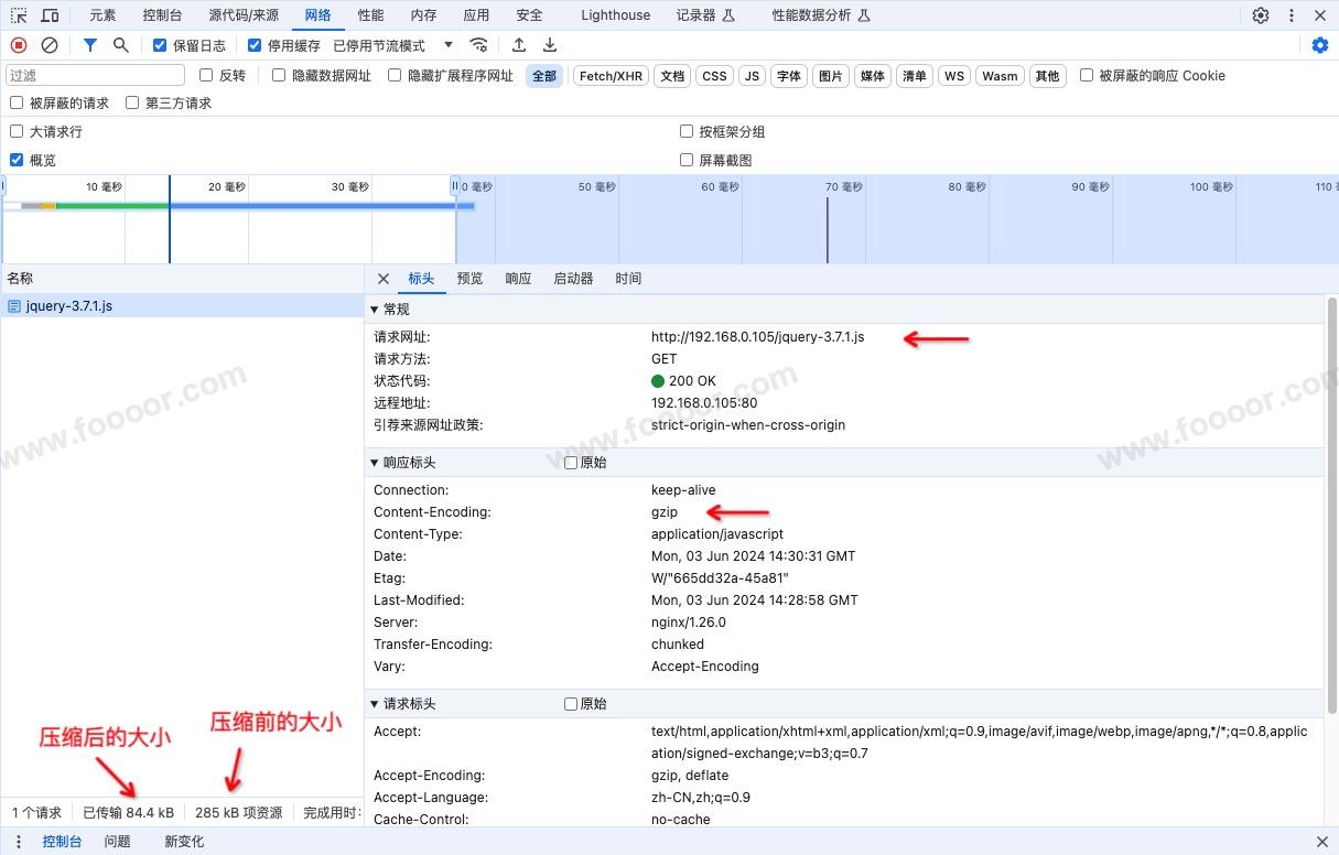 我在站点下面放了一个 js 文件,然后通过 Nginx 请求这个文件,在浏览器中使用开发者工具可以查看到请求的情况。