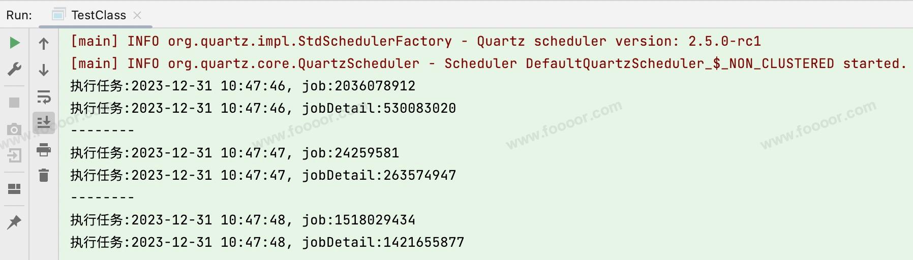 每次打印日志的 Job 和 JobDetail 对象都是不一样的,也就是每次执行任务都会创建新的 Job 和 JobDetail 对象。
