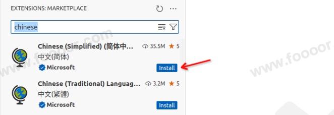 搜索 chinese ,安装一下 VSCode 的汉化包: