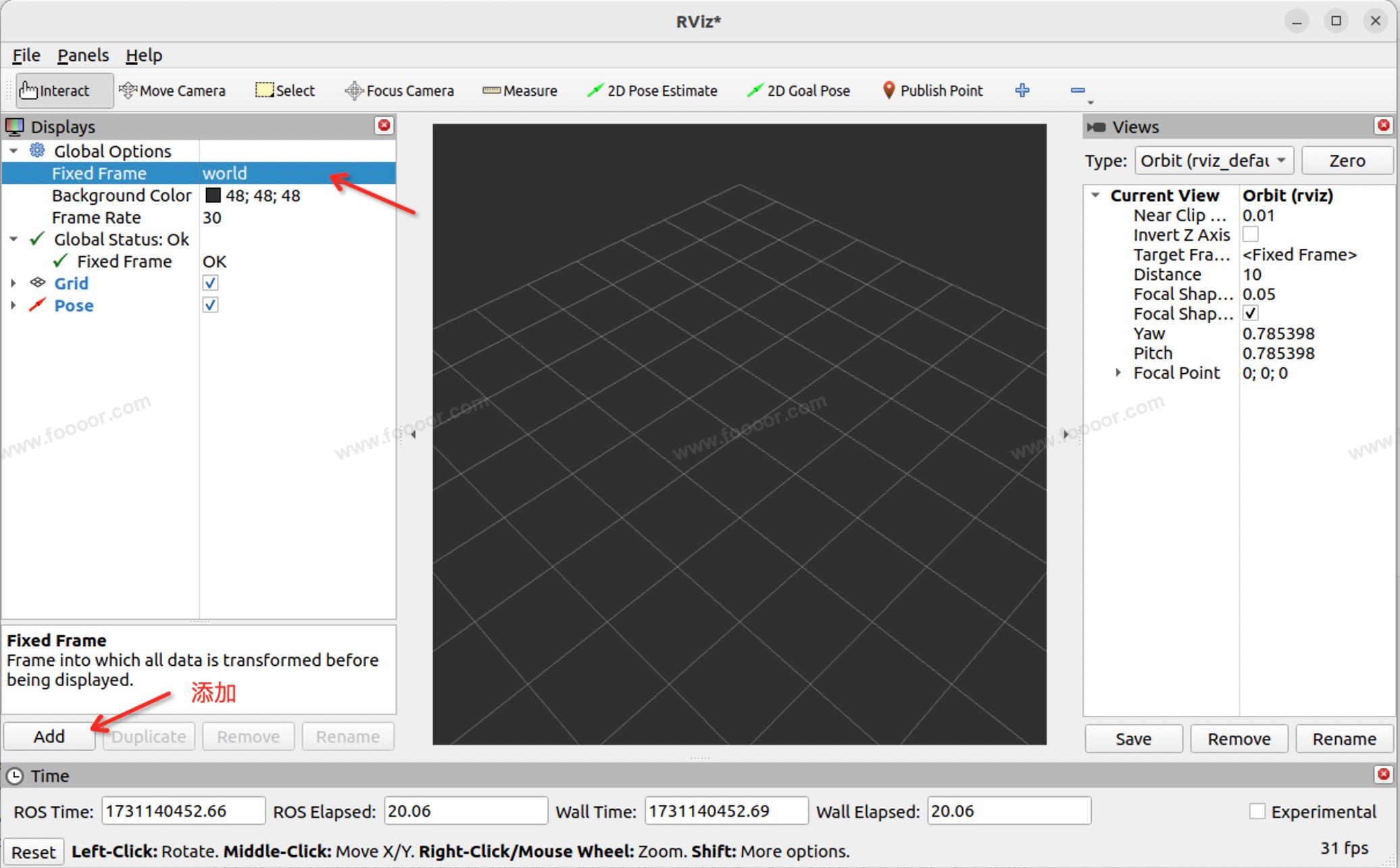 打开 rviz 后,Global Options -> Fixed Frame 选择根坐标系,也就是 world :