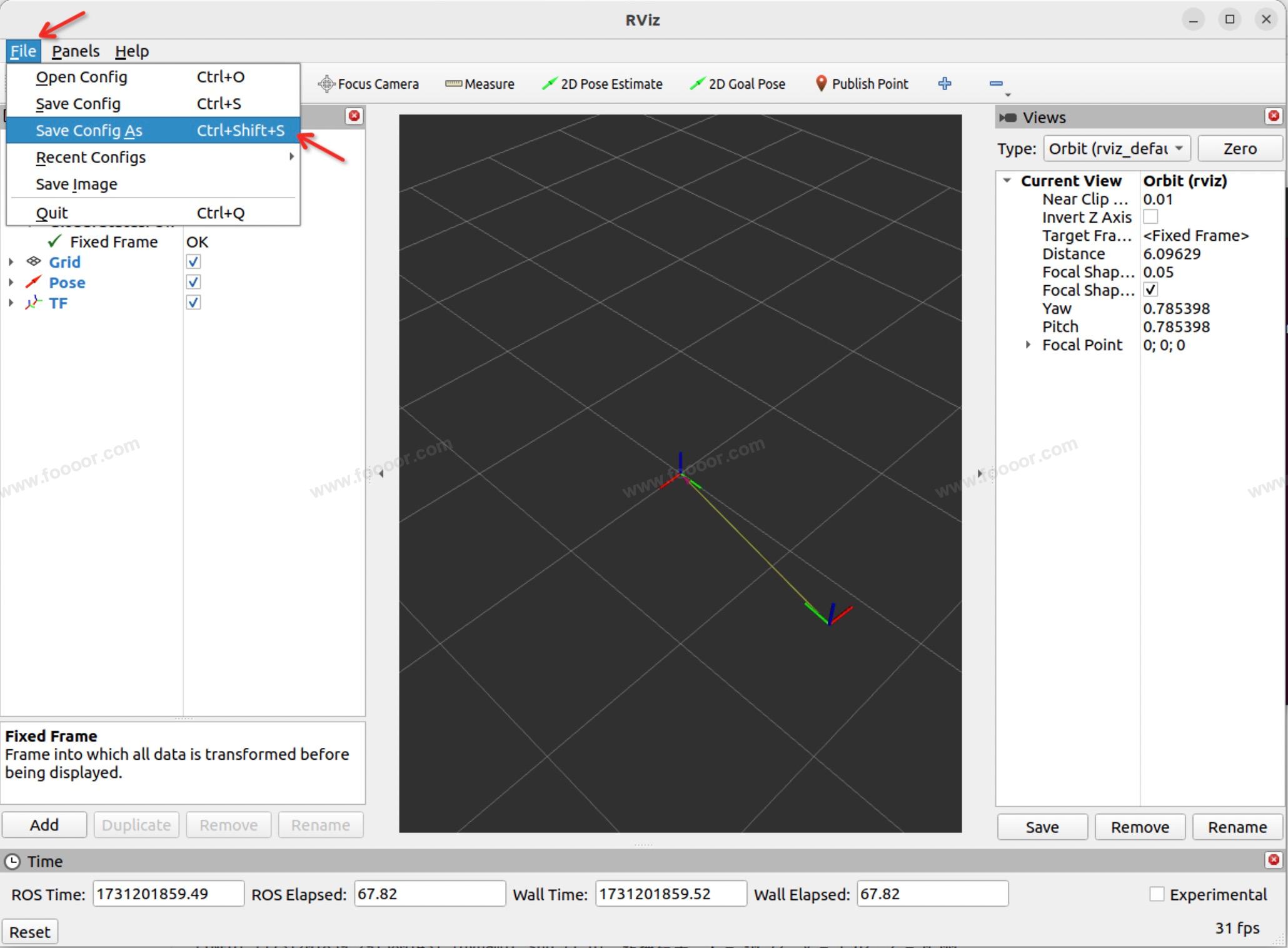 添加完成自己想要查看的视图后,点击 File -> Save Config As ,保存配置文件到指定的目录,文件名称为 .rviz 结尾。
