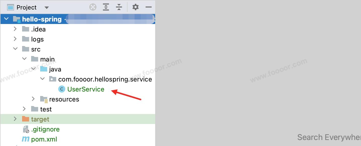 这里创建一个 UserService.java 类,我们要实现的就是让 Spring 创建这个类的对象。