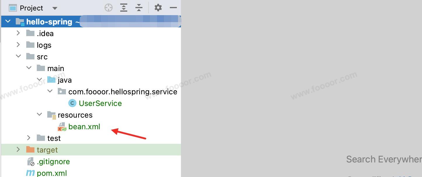 <bean id="userService" class="com.foooor.hellospring.UserService">