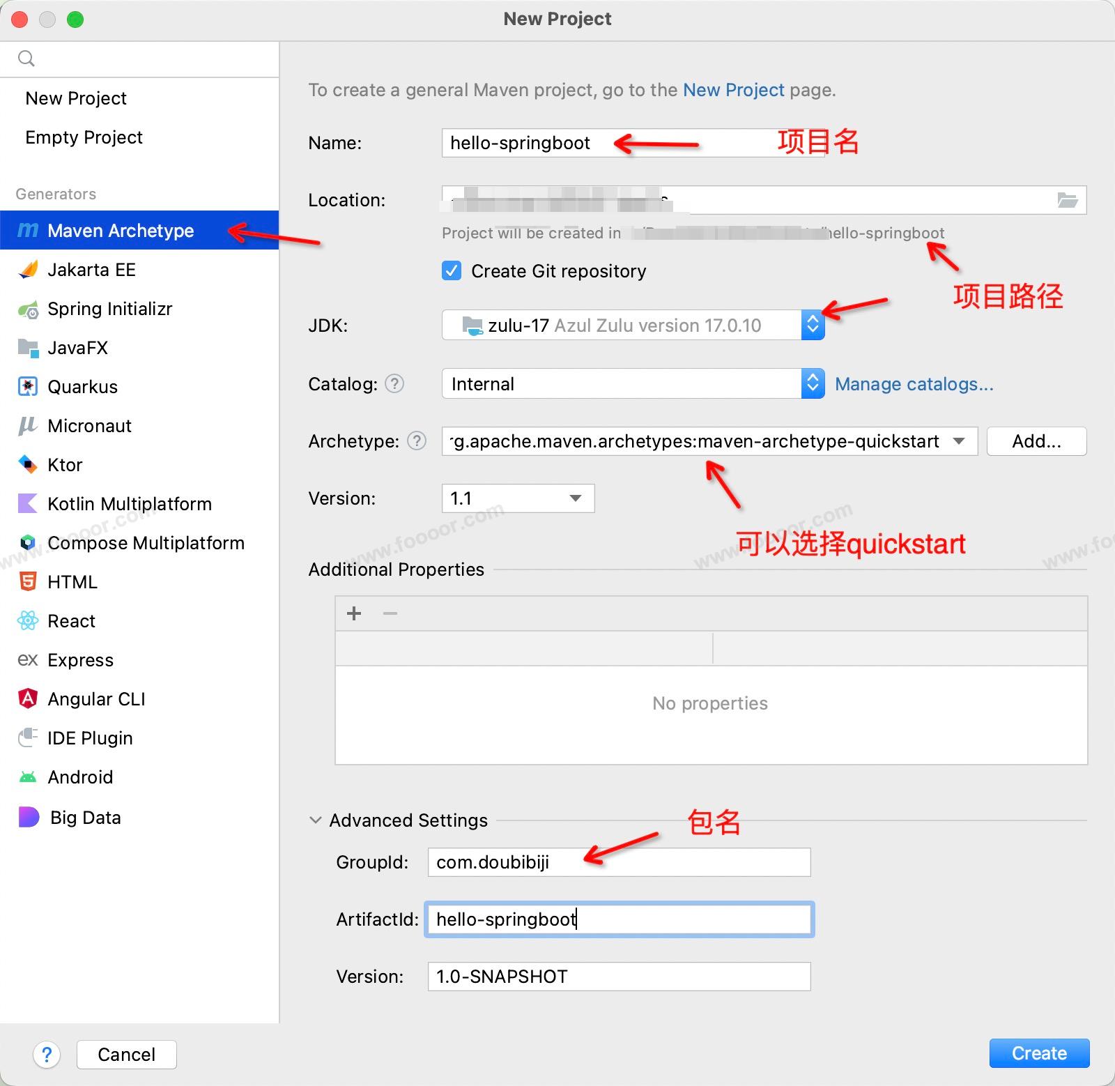 在IDEA中,File --> New --> Project --> 选择 Maven Archetype,然后填写项目信息: