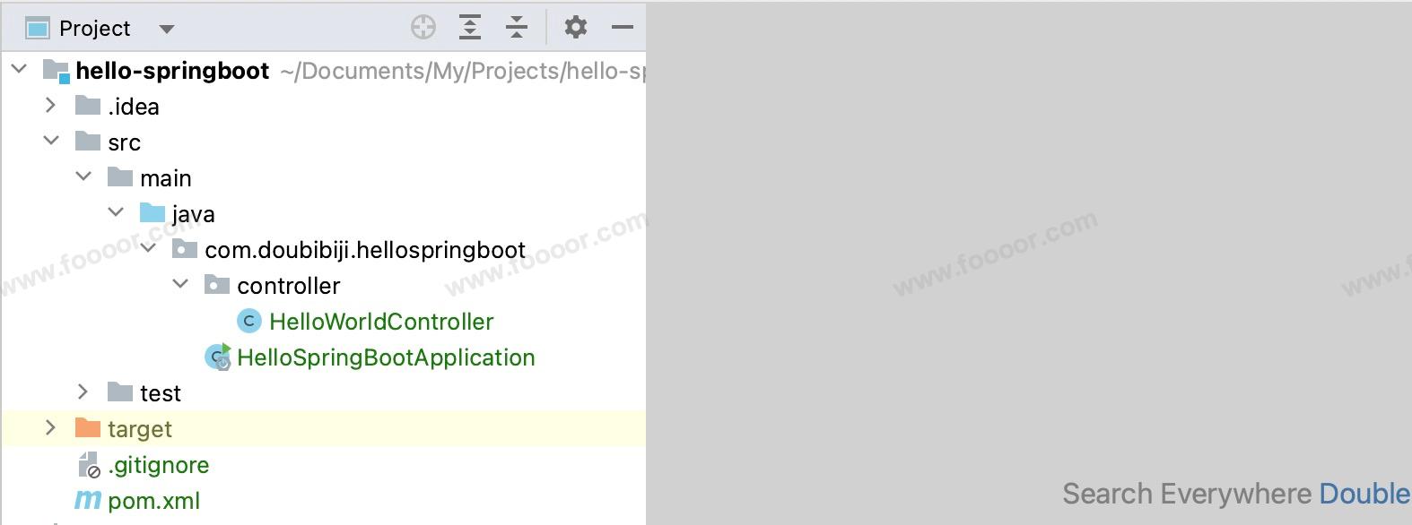 在 com.doubibiji.hellospringboot 包下创建 controller 包,在包下创建 HelloWorldController 类(名称随意),如下: