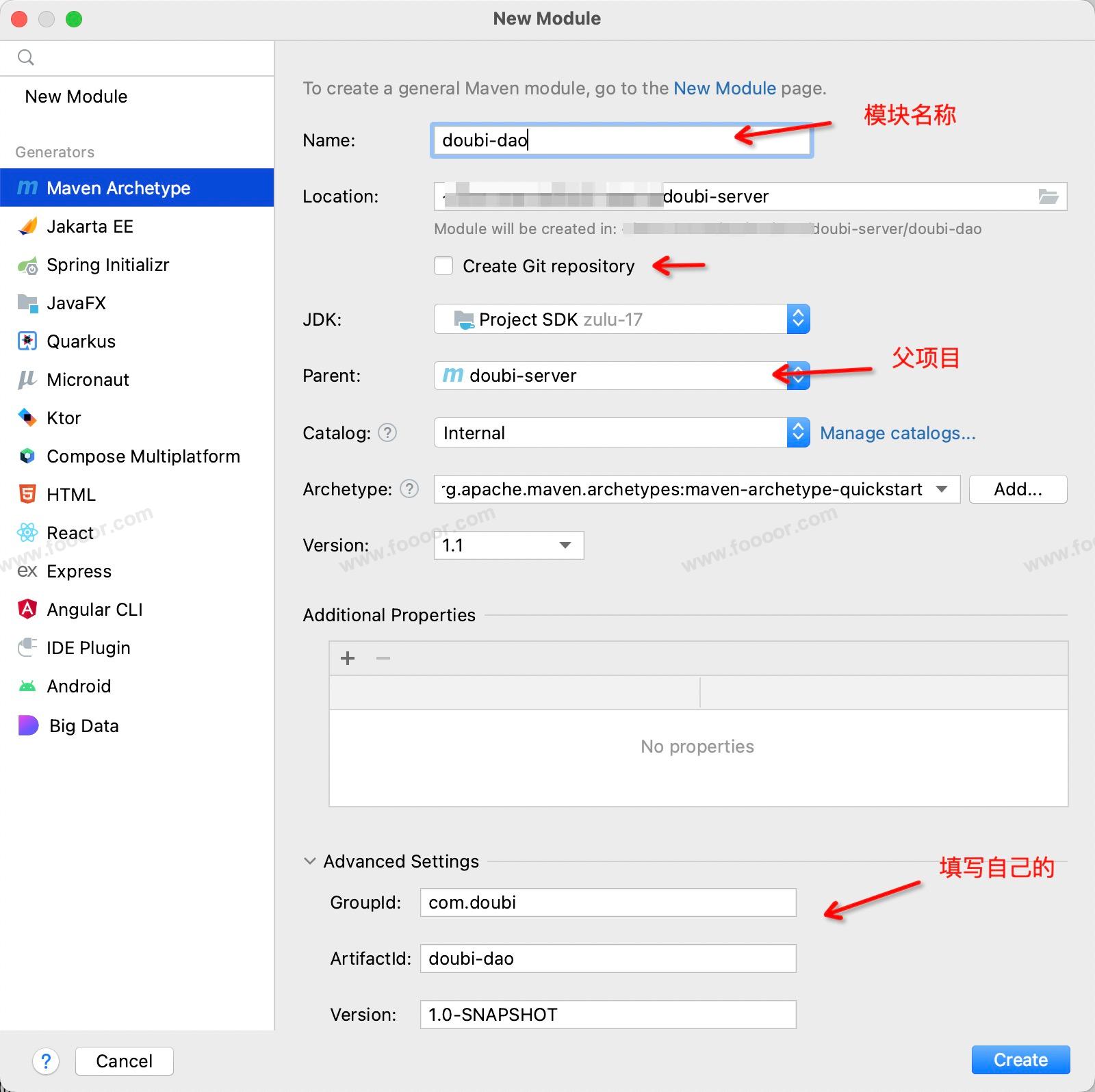 创建子模块的时候,可以使用 Spring Initializr 创建,这里为了清晰,我时候用 Maven 项目手动来创建。