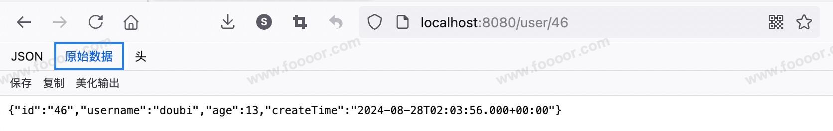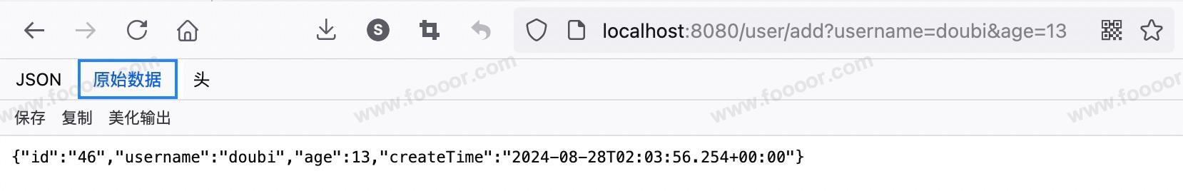 请求接口添加数据:http://localhost:8080/user/add?username=doubi&age=13