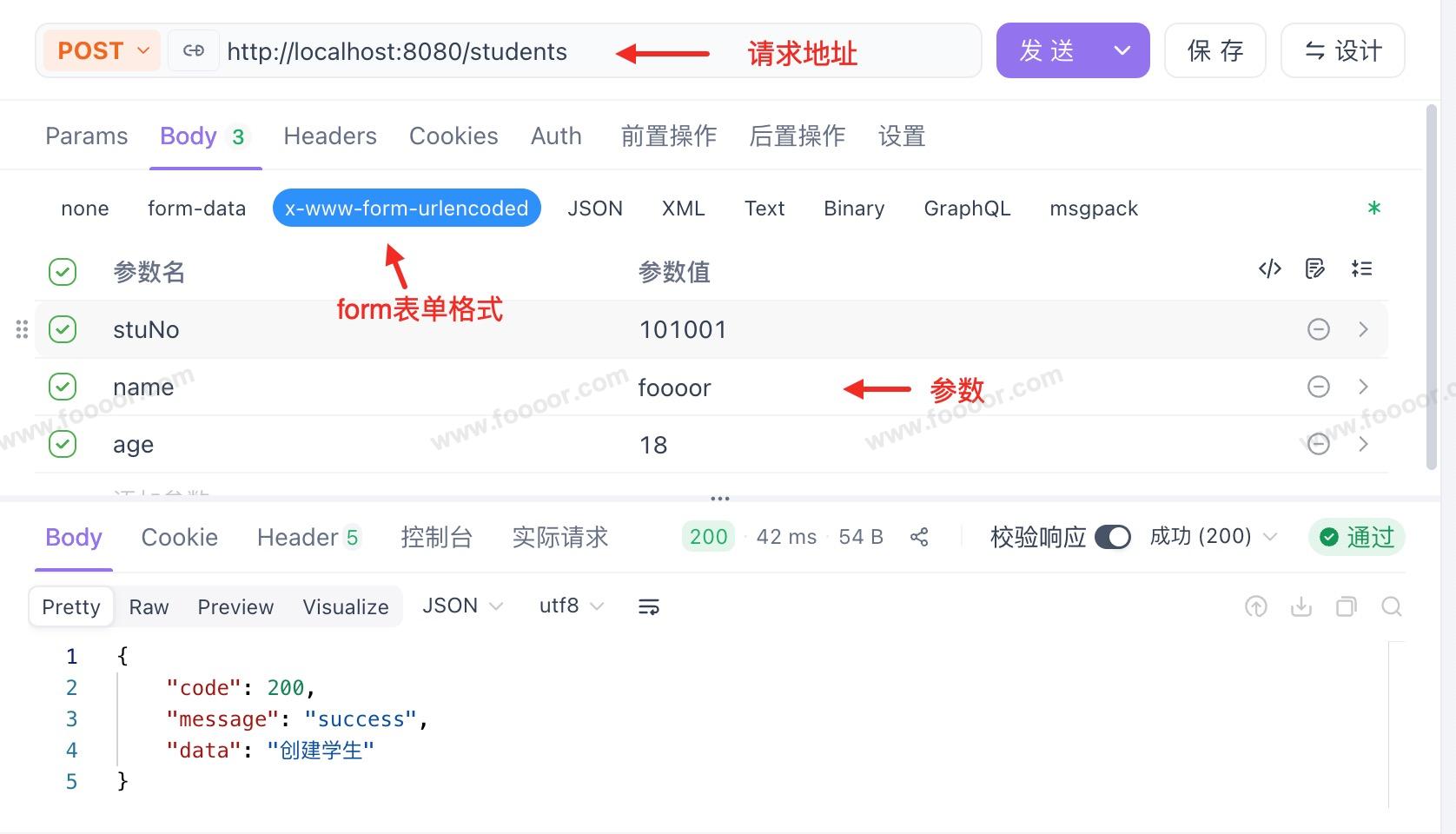 下面使用 Apifox 请求该接口,并在 body 中,使用 x-www-form-urlencoded 的方式传递参数: