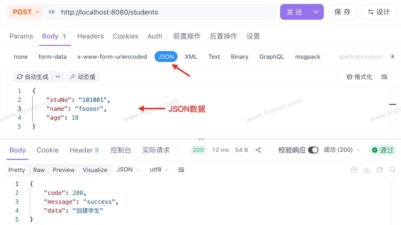 例如前端或调用者通过如下方式调用接口,body 数据格式选择 JSON: