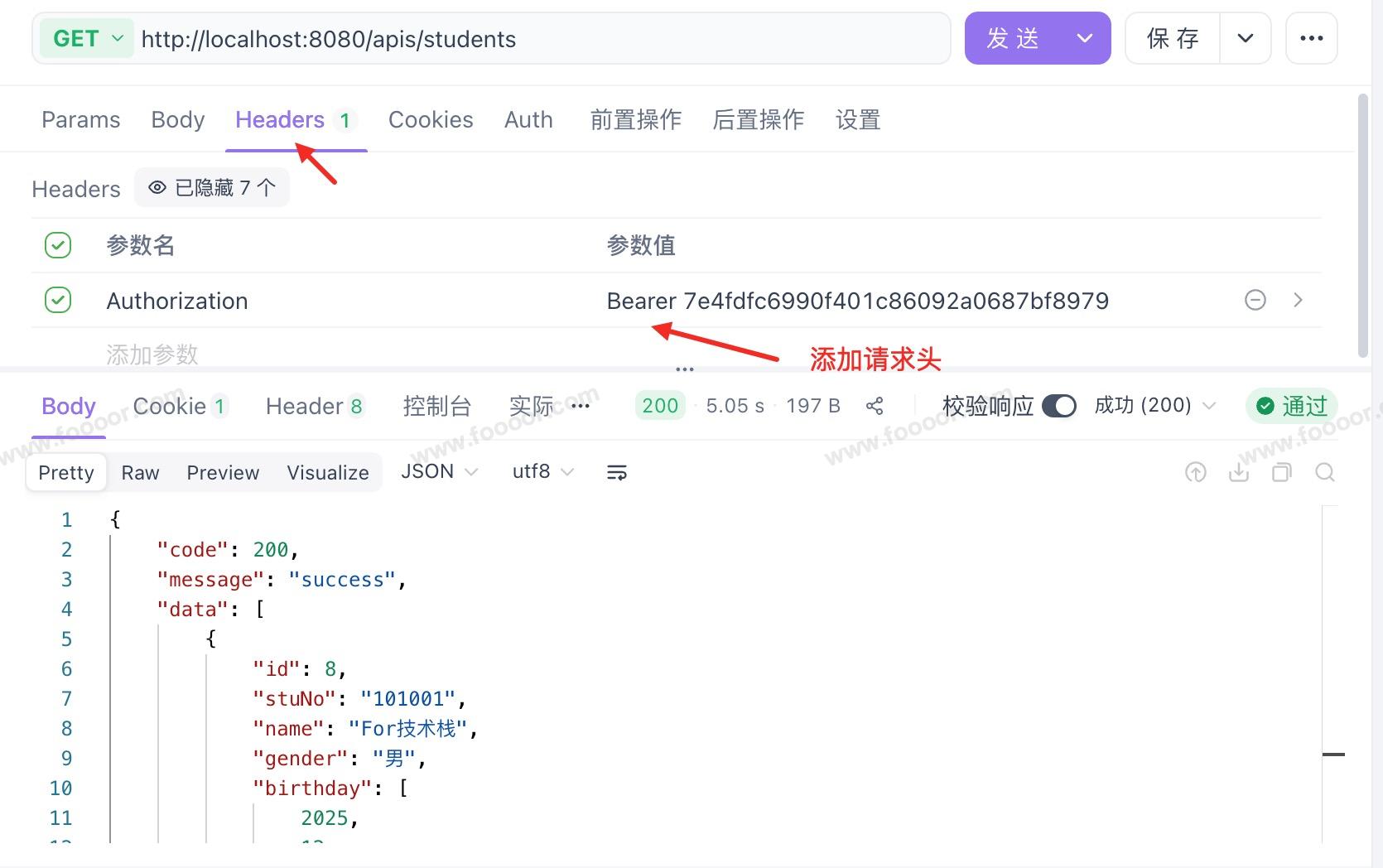 拿到 token 以后,再次请求学生列表接口,并在请求头中添加登录获取到的 token,可以发现请求成功了: