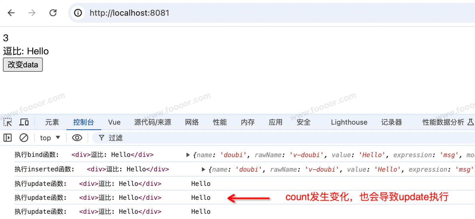 element.innerText = "逗比: " + binding.value // 数据更新后,前面添加上逗比