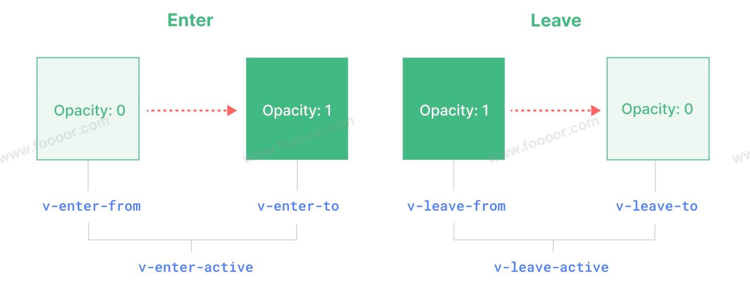 v-enter-from:进入动画的起始状态。在元素插入之前添加,在元素插入完成后的下一帧移除。v-enter-active:进入动画的生效状态。应用于整个进入动画阶段。在元素被插入之前添加,在过渡或动画完成之后移除。这个 class 可以被用来定义进入动画的持续时间、延迟与速度曲线类型。v-enter-to:进入动画的结束状态。在元素插入完成后的下一帧被添加 (也就是v-enter-from被移除的同时),在过渡或动画完成之后移除。