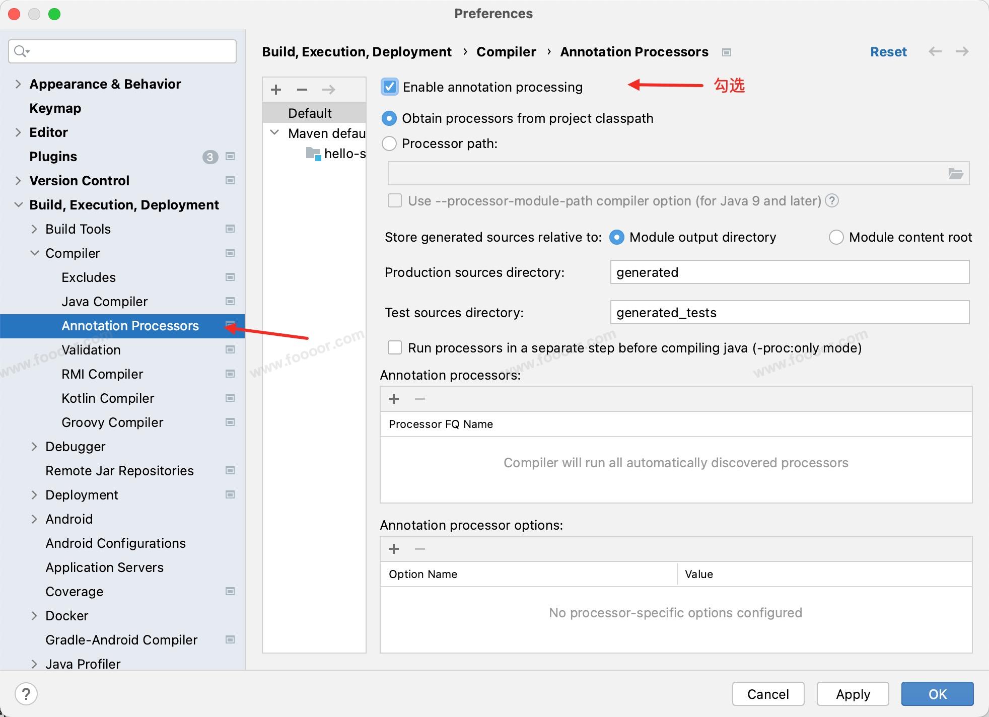 打开 IDEA 配置,找到 Annotation Processors(可以直接搜索annotation),勾选 Enable annotation processing 。当勾选此选项后,IntelliJ IDEA 会在编译时调用 Lombok 的注解处理器。