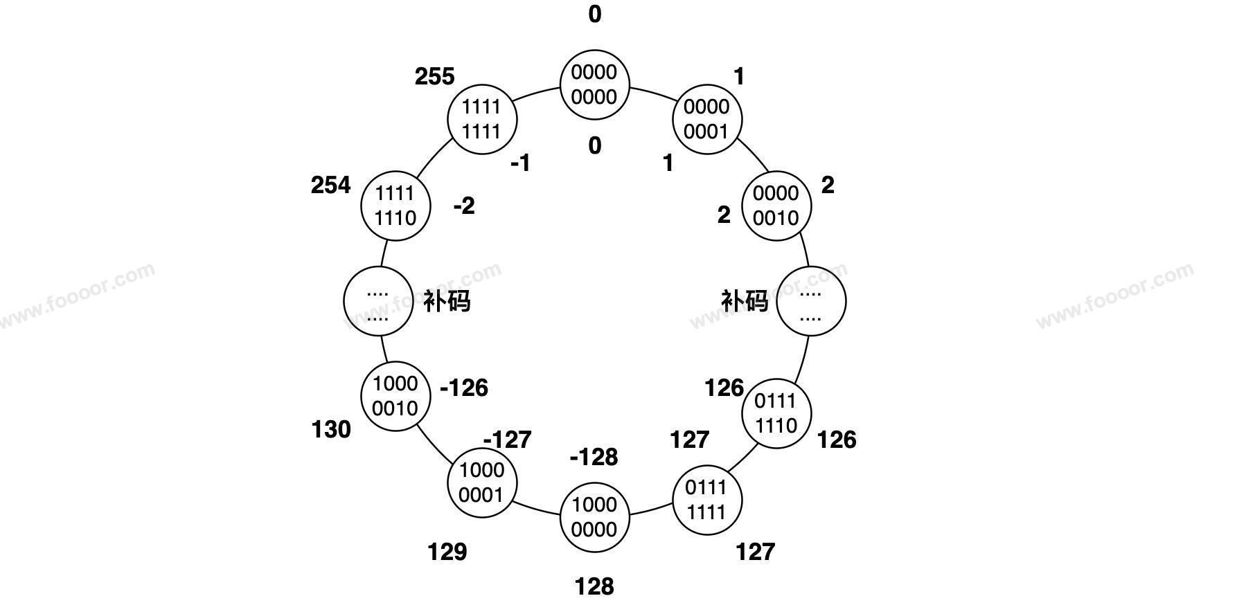 可以看到补码的运算不用考虑符号位,而且只有1个0,就是 0000 0000。