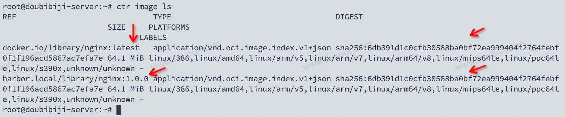 ctr image tag docker.io/library/nginx:latest harbor.local/library/nginx:1.0.0harbor.local 是私有仓库的主机;library 是 Harbor 中的项目名称,要与之对应;给 nginx 添加了 1.0.0 的tag。
