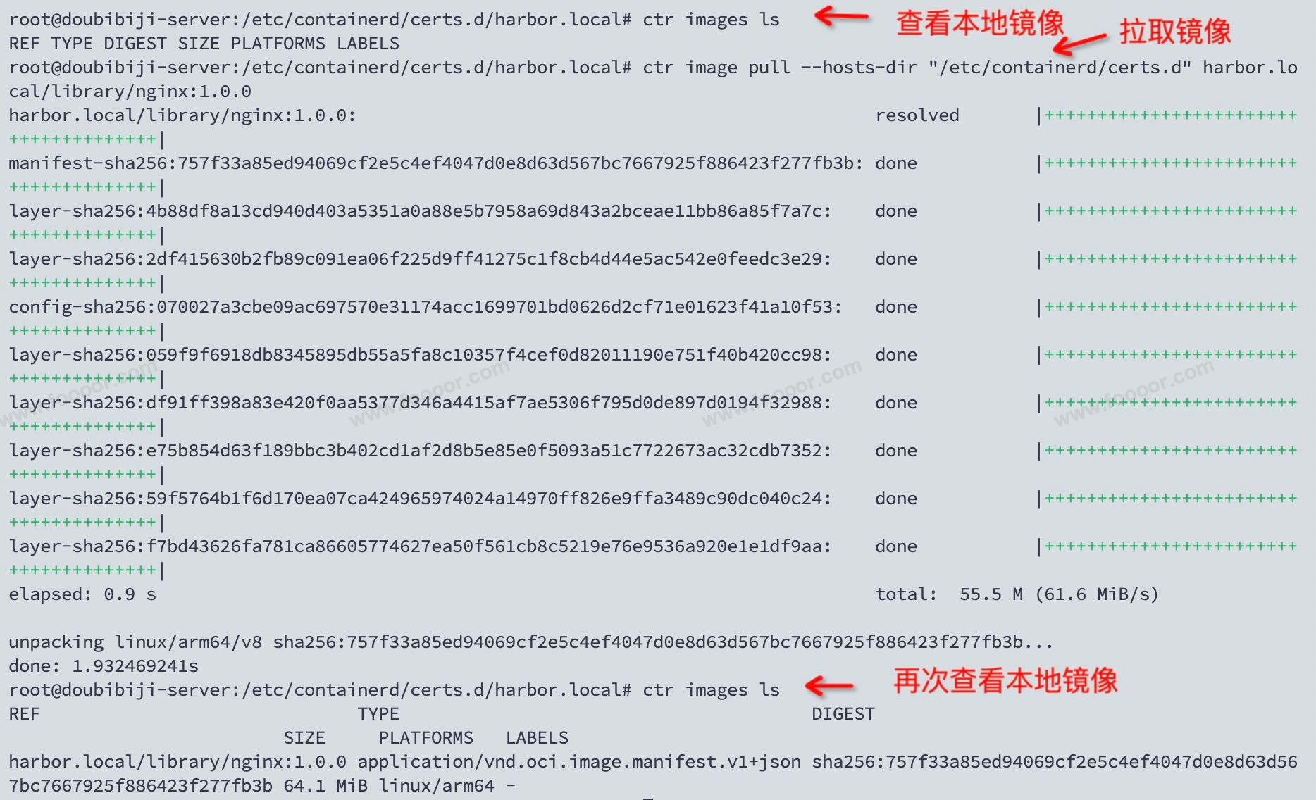 ctr image pull --hosts-dir "/etc/containerd/certs.d" harbor.local/library/nginx:1.0.0
